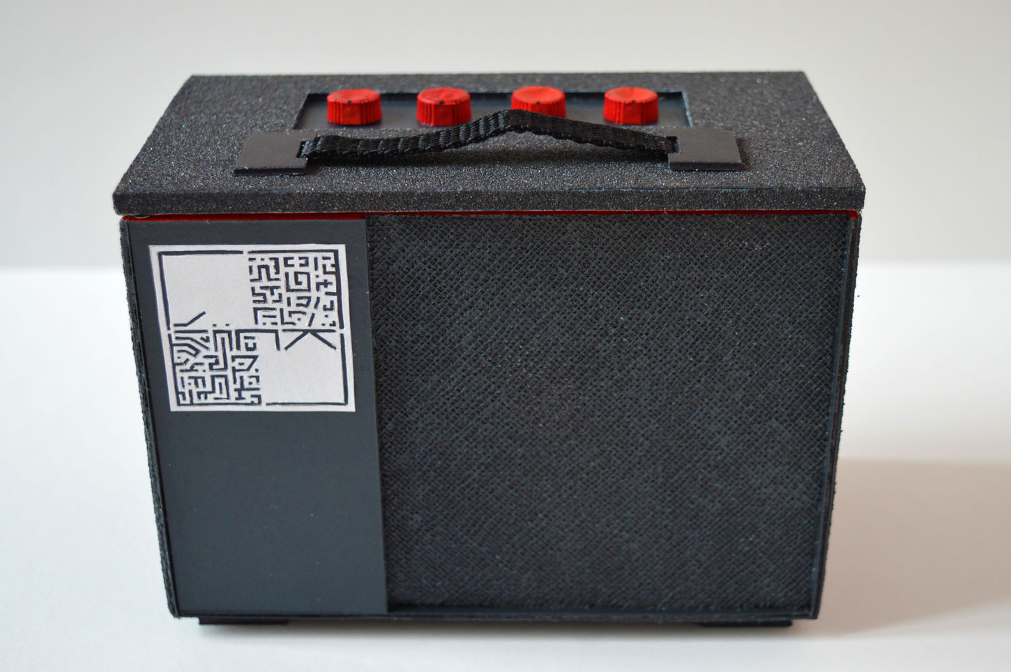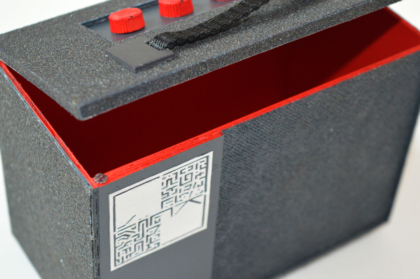 Création d’une boite de rangement pour petits accessoires de musique. Son design s’inspire des amplis de guitare. La boite dispose d’une fermeture à rabat aimantée.
