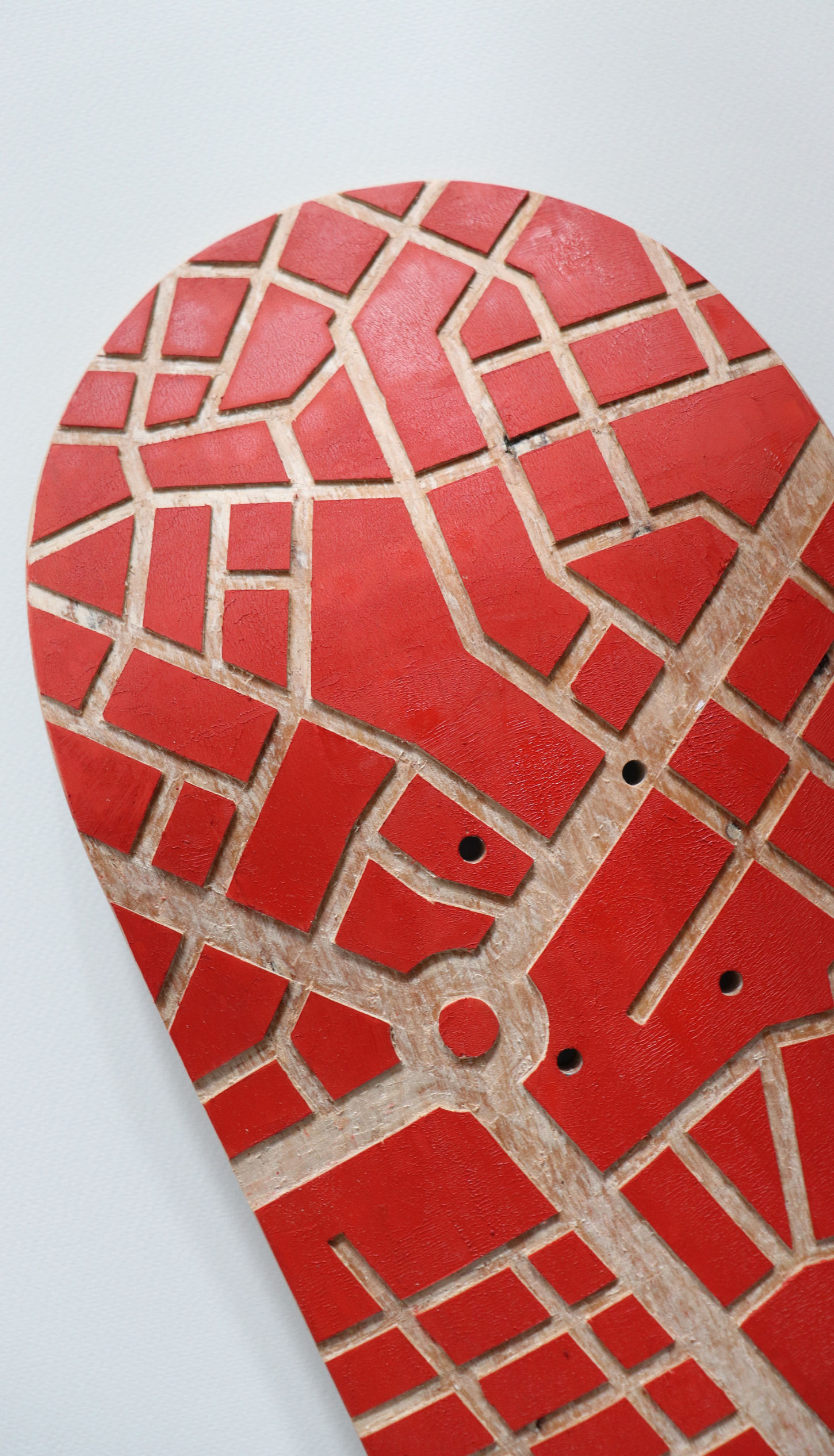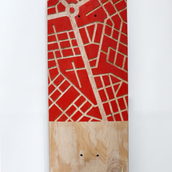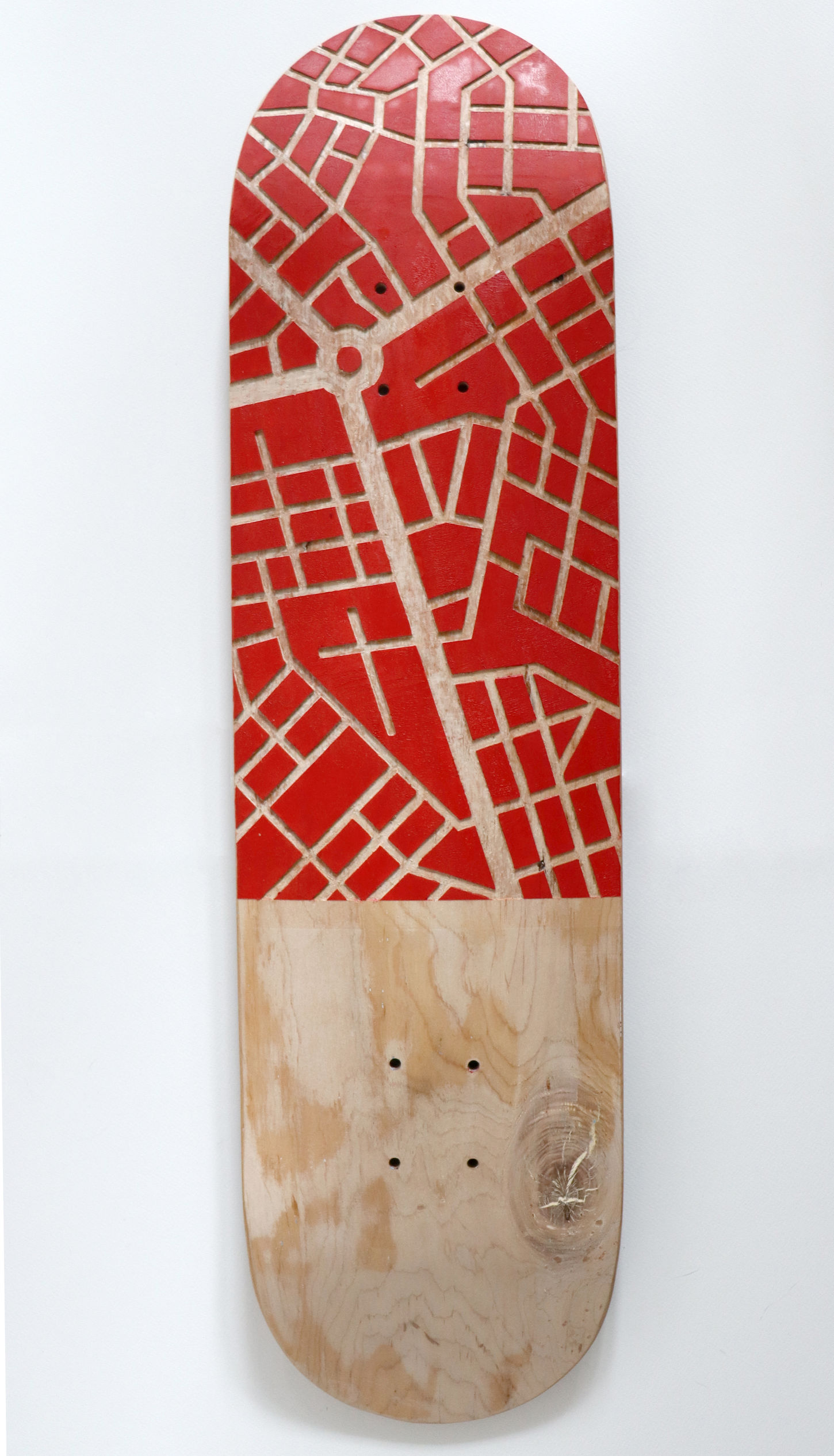 Cette planche de skateboard usée a été gravée pour lui offrir une seconde vie. Les motifs s’inspirent de paysages de villes vu du ciel. La planche fait parti d'une série et met en opposition le monde urbain et la nature.